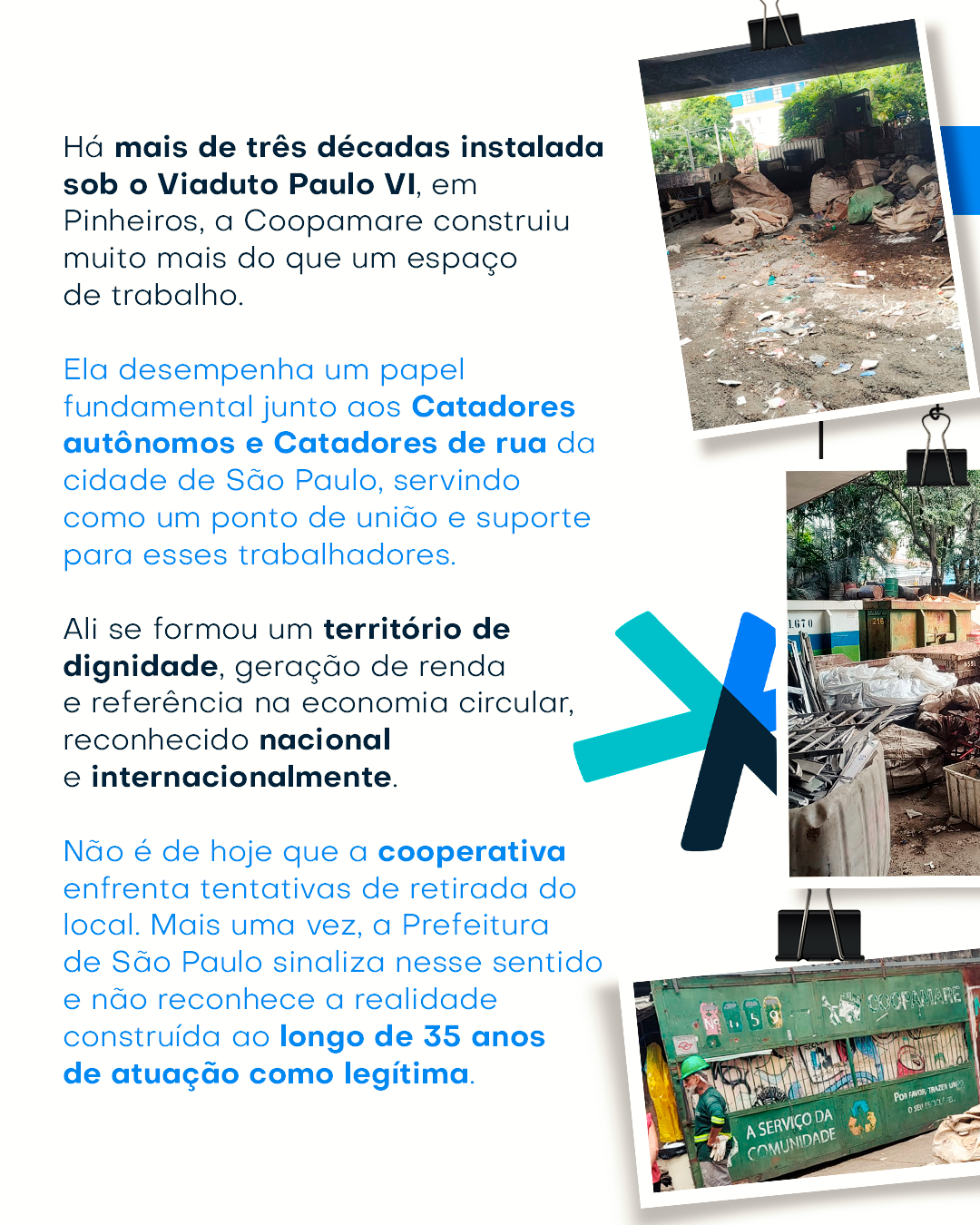 Há mais de três décadas instalada sob o Viaduto Paulo VI, em Pinheiros, a Coopamare construiu muito mais do que um espaço de trabalho. Ela desempenha um papel fundamental junto aos Catadores autônomos e Catadores de rua da cidade de São Paulo, servindo como um ponto de união e suporte para esses trabalhadores. Ali se formou um território de dignidade, geração de renda e referência na economia circular, reconhecido nacional e internacionalmente.