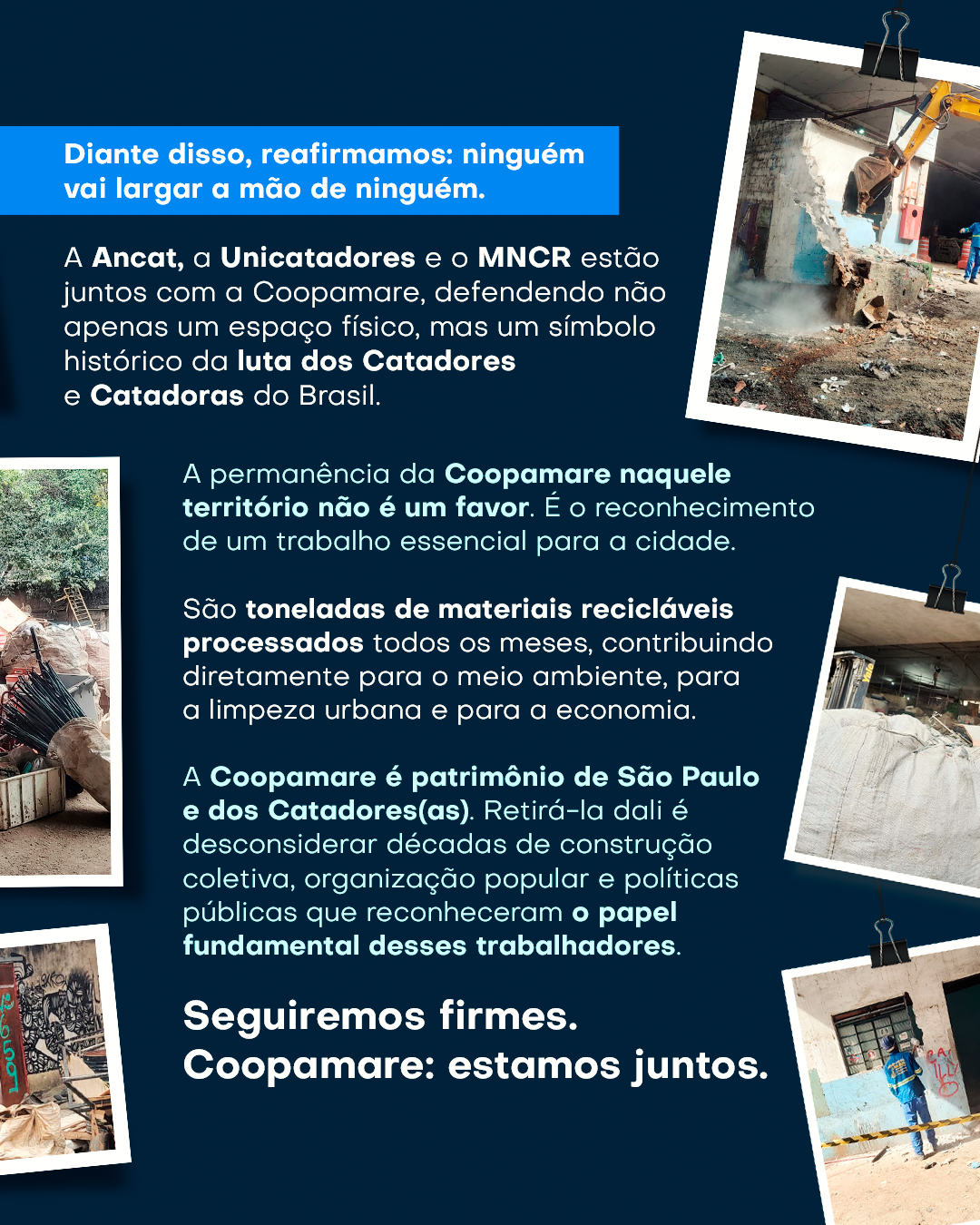 A Ancat, a Unicatadores e o MNCR estão juntos com a Coopamare, defendendo não apenas um espaço físico, mas um símbolo histórico da luta dos Catadores e Catadoras do Brasil.